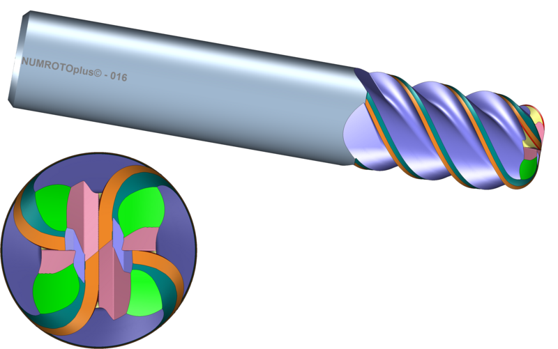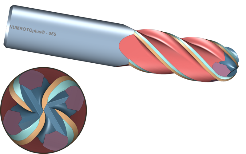 - Fräser mit 4 Zähnen (2 Zentrumsschneiden) und S-Form an der Kugelstirn.