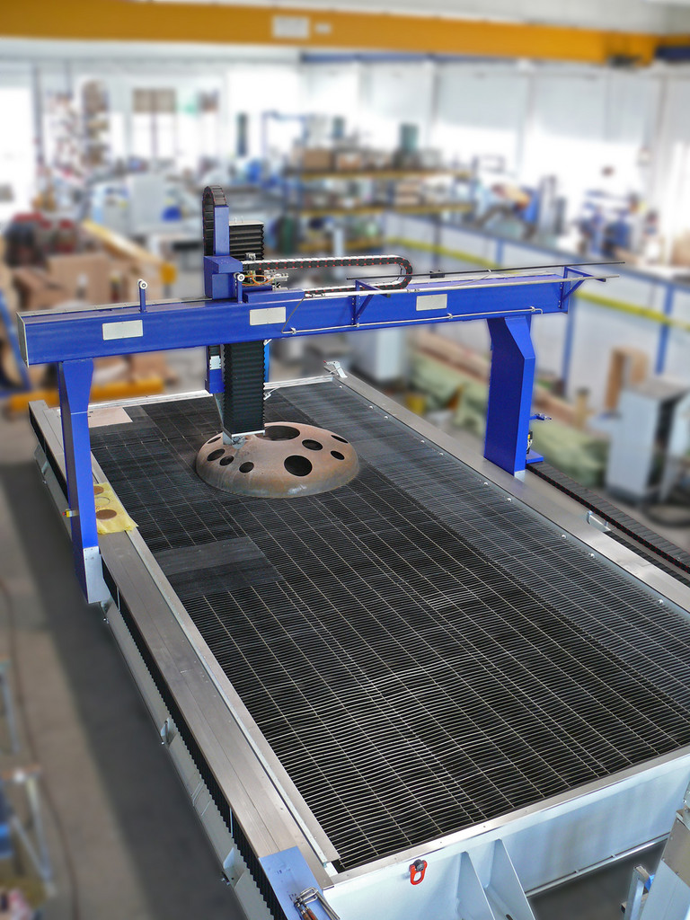 Questa macchina è idonea per il taglio di piastre 2D di qualsiasi tipo o per il taglio 3D di vari pezzi quali tubi, serbatoi o coperchi per serbatoi di accumulo pressione, come i fondi Klöpper, rappresentati in questa figura. La macchina è concepita in modo da poter montare una testa di saldatura a 5 assi e può quindi essere utilizzata anche come saldatrice automatica.