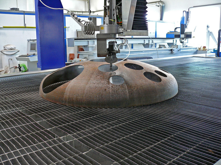 Nel caso della macchina illustrata si tratta di un impianto di taglio a getto d’acqua a 5 assi in grado di realizzare efficientemente tagli su acciaio di spessore fino a 140 mm e su alluminio fino a 180 mm, tramite getto d’acqua da 4000 bar con miscela di sostanze abrasive. Il fondo Klöpper, anch’esso rappresentato, formato da acciaio spesso 6 mm, può essere tagliato in modo preciso con avanzamento da 330 mm al minuto. In questo caso è possibile programmare l’angolo di taglio desiderato. Inoltre è possibile tagliare faccette, già preparate per la successiva saldatura di ulteriori pezzi quali per es. flange, tubi, scambiatori di calore, ecc. In tal modo è garantito uno svolgimento rapido del lavoro.