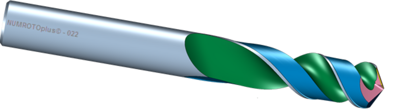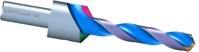 - This example shows a stepdrill with differential helix. The changing helix angle along the step is clearly visible.