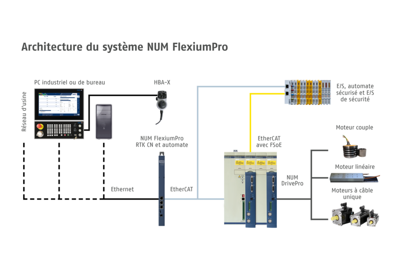 Les constructeurs de machines et les équipementiers familiers de la CN Flexium+ de NUM trouveront très facile de migrer vers FlexiumPro. Les langages de programmation et l'environnement de l'automate sont identiques à ceux de Flexium+, les programmes pièces restent compatibles avec les deux systèmes, les interfaces logicielles des IHM (interfaces homme-machine) personnalisées restent très similaires et tous les terminaux EtherCAT et les dispositifs de sécurité sont inchangés.