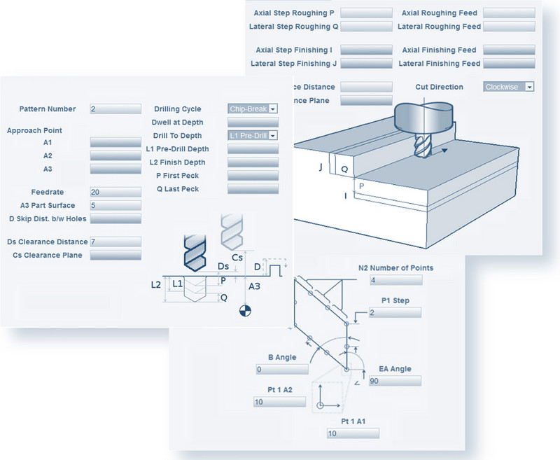 In addition to a large number of canned cycles, the NUMmill software provides functions for material removal of basic pockets; these can be defined as circular, oblong, reticular and square. The hole pattern definitions can use a wide variety of geometries, including Arc, Cover Patter, Drilling with Rotary Axis, Grid, Pitch Circle, Row, and Single Points. Milling operations can be performed on circular, oblong, rectangular and square pockets. The drilling cycles that can be performed on hole patterns include Center Drill or Chamfer, Peck, Chip, Counter Bore, Tap, Ream-Feed Out, Bore-Dwell/Feed Out, Bore-Stop/Rapid Out, Thread Chase, and Taper Threading.