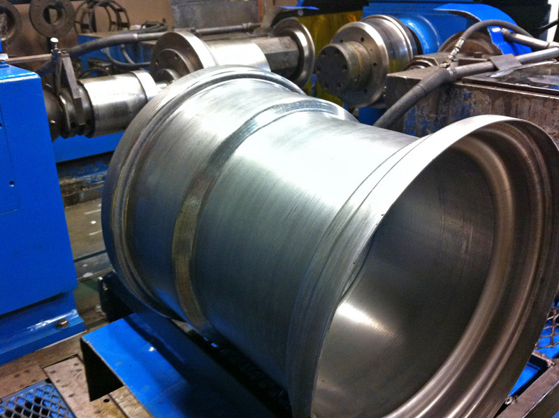Aero Race Wheels utilizes spin forming techniques to produce its high performance racing wheels. The process involves rotating a cylindrical steel work piece and a forming tool at high speed while exerting localized pressure using a roller, causing the metal to flow over the tool. The technique is ideal for manufacturing axially symmetric parts such as wheel rims. It creates a very strong, seamless component from a single piece of material, with little or no scrap.