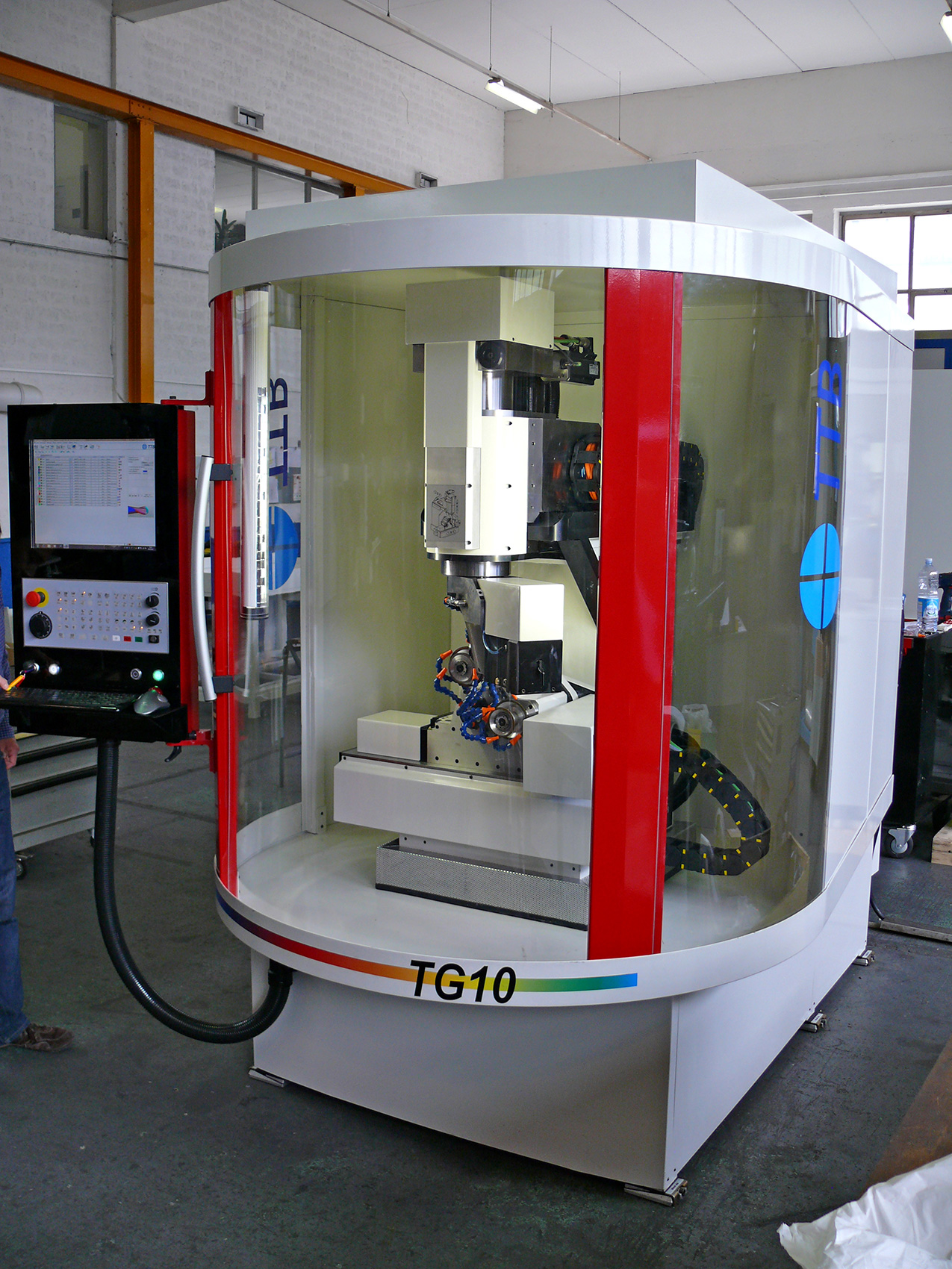 The new kinematics of the TG10 introduce precisely controlled movement to the tool grinding process. The machine’s innovative vertical axis architecture was developed by TTB and capitalizes on the performance of NUM’s latest generation axis drives to boost productivity by means of fast feed rates and short traverse paths. High levels of stability and rigidity are ensured by the design’s exceptionally compact nature; the machine only requires a small amount of space at the user’s production facility, which simplifies installation and helps reduce costs.